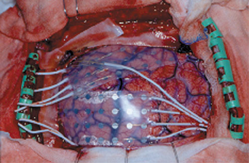 But an eletrocorticograph (ECoG, pronounced “eecog”), like the one used for this experiment, sits on the brain itself, like this: