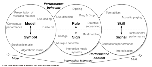 We have developed a paradigm of interaction and musical context based on Jens Rasmussen’s model of human information processing [12], previously used to aid DMI design in [13]. Rasmussen examines the functions of “man-made systems” and human interaction in terms of the user’s perception and the reasons (rather than causes) behind system design and human behavior. He describes interaction behaviors as being skill-, rule-, or knowledge-based. Rasmussen himself suggests that knowledge-based might be more appropriately called model-based, and we believe this term more clearly denotes this mode of behavior, particularly during performance of music, as “musical knowledge” can have various conflicting definitions.